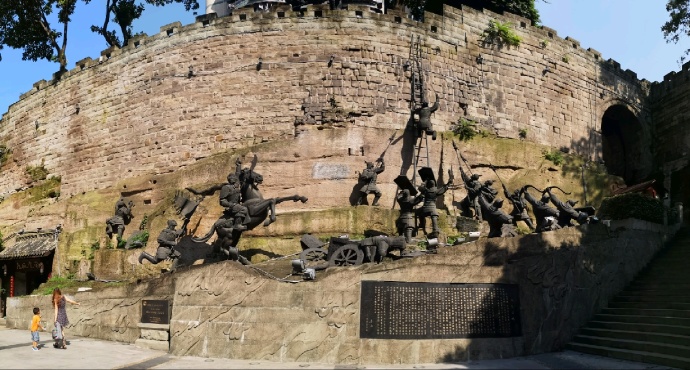 通远门城墙遗址公园由广场、城墙、雕塑组成。雕塑叙述了老城墙筑城、守城、攻城的历史故事,辅以《炒米糖开水》和《滑竿》两组民俗雕塑,市井味浓郁,是游人感受重庆历史文化的场所之一。